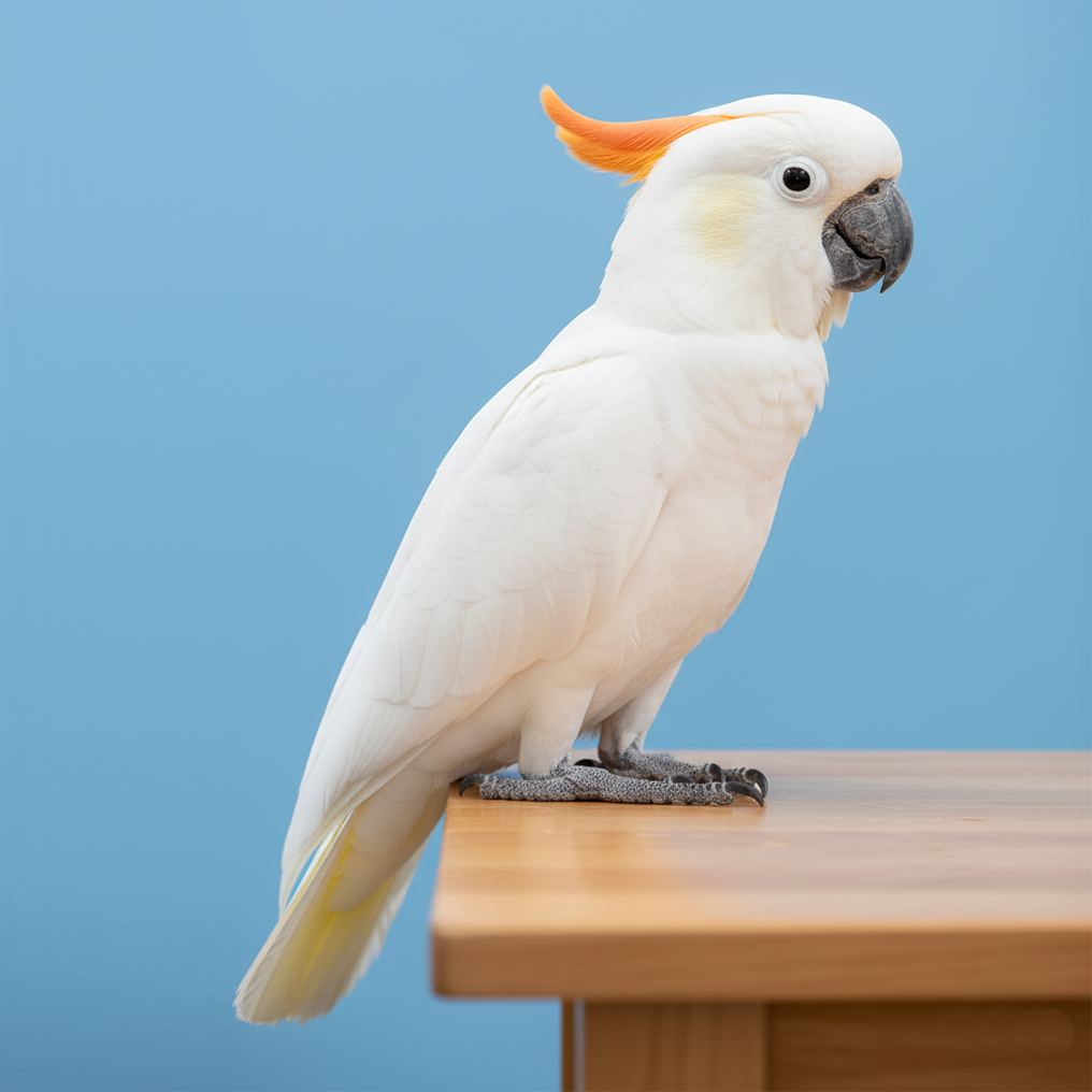 A medium-sized, playful cockatoo distinguished by its bright orange crest, offering a slightly more manageable volume and size than its larger cousins.